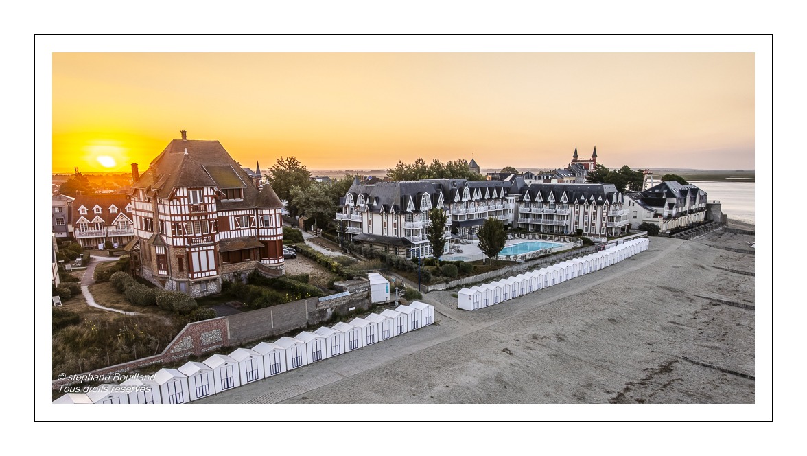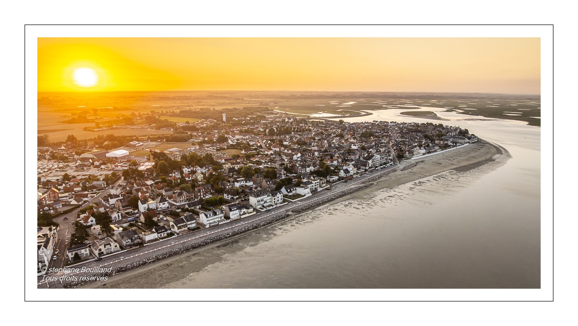 Depuis les airs, le drone révèle toute la poésie du lieu : la plage qui s’étire à perte de vue, rythmée par ses cabines blanches alignées comme des perles, et au-delà, l’immensité de la Baie de Somme. À cette heure matinale, la lumière chaude et rasante enveloppe les paysages d’une douceur particulière, entre ciel, sable et mer.